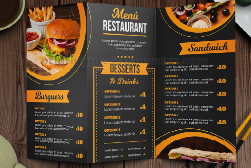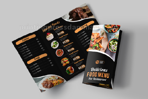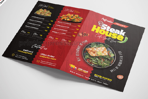 Tri-fold menu print creates six panels for organized sections, perfect for restaurants to showcase appetizers, mains, desserts, and drinks clearly.