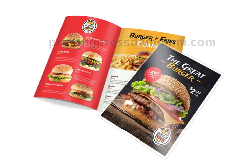 Booklet menu print offers multi-page layouts, perfect for extensive restaurant offerings, detailed descriptions, and elegant presentation of diverse dishes.