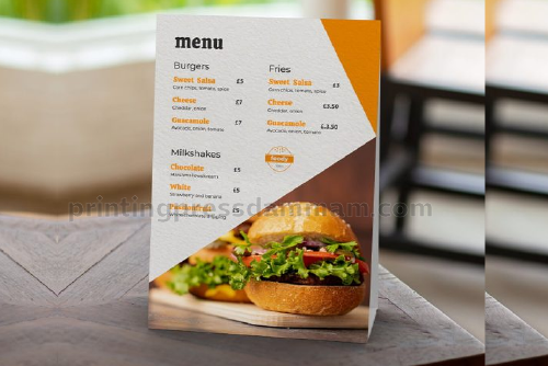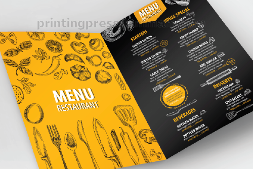 You can print single-page, bi-fold, tri-fold, booklet, laminated, plastic/PVC, and digital menus.
